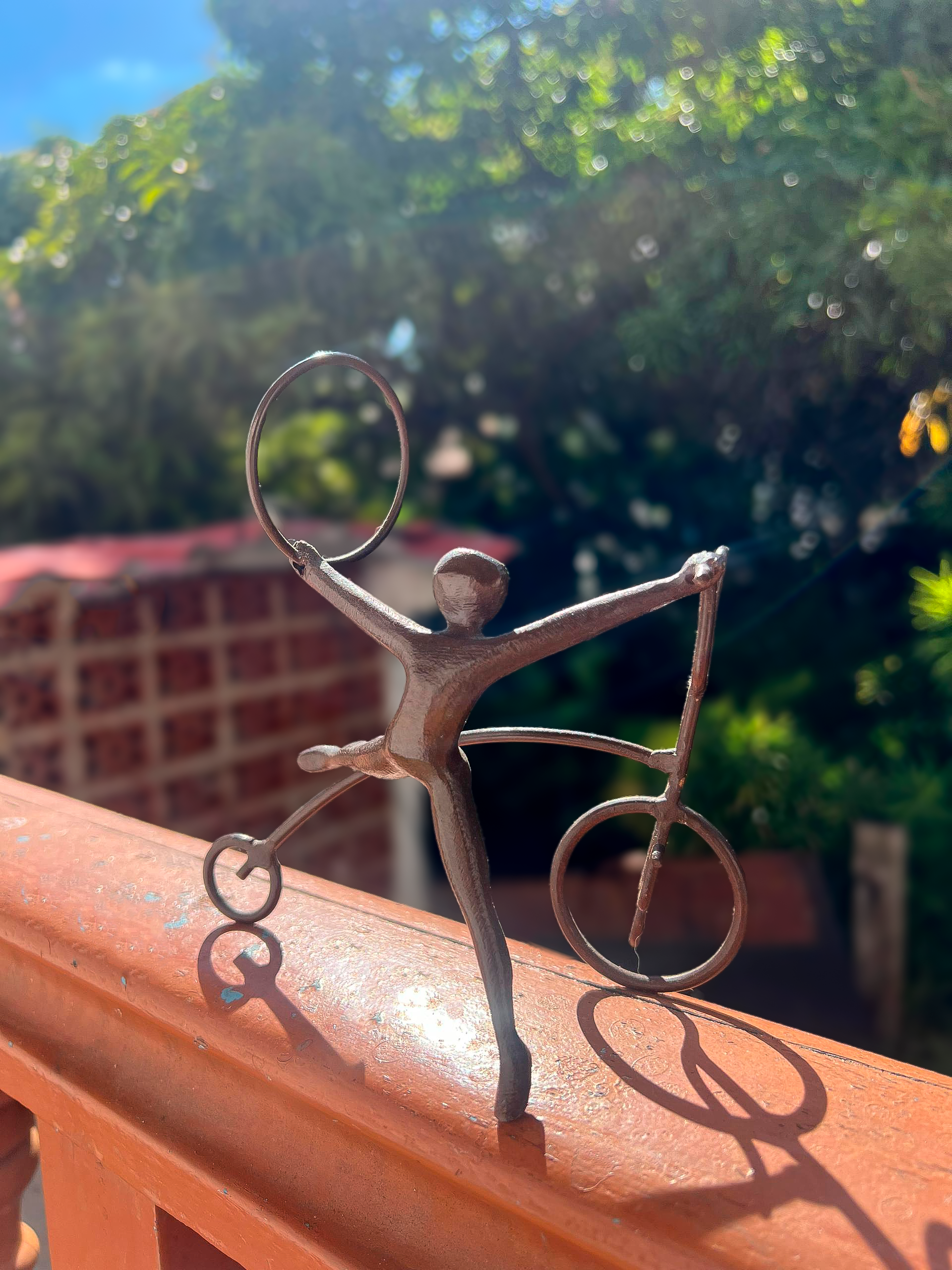 Esta escultura en bronce destaca por su estética minimalista y su depurada técnica de síntesis formal. La pieza presenta la figura estilizada de un niño junto a su bicicleta, portando un aro en su mano derecha, reduciendo la escena a sus líneas más esenciales y puras.